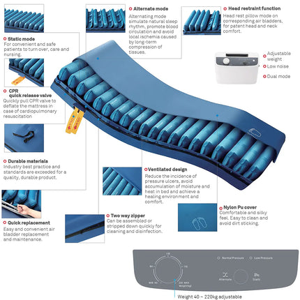 ALTERNATING PRESSURE TECHNOLOGY: Alternating pressure redistributes body weight and reduces constant pressure on specific areas, helping to prevent pressure sores and ulcers.