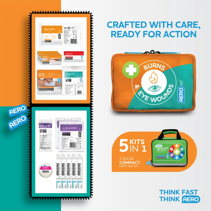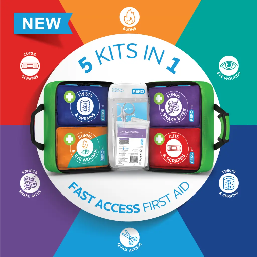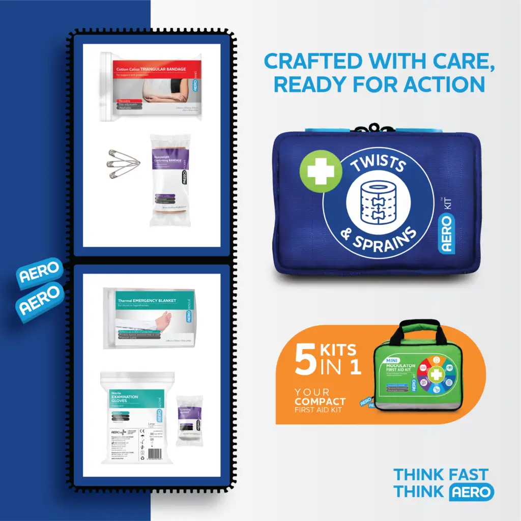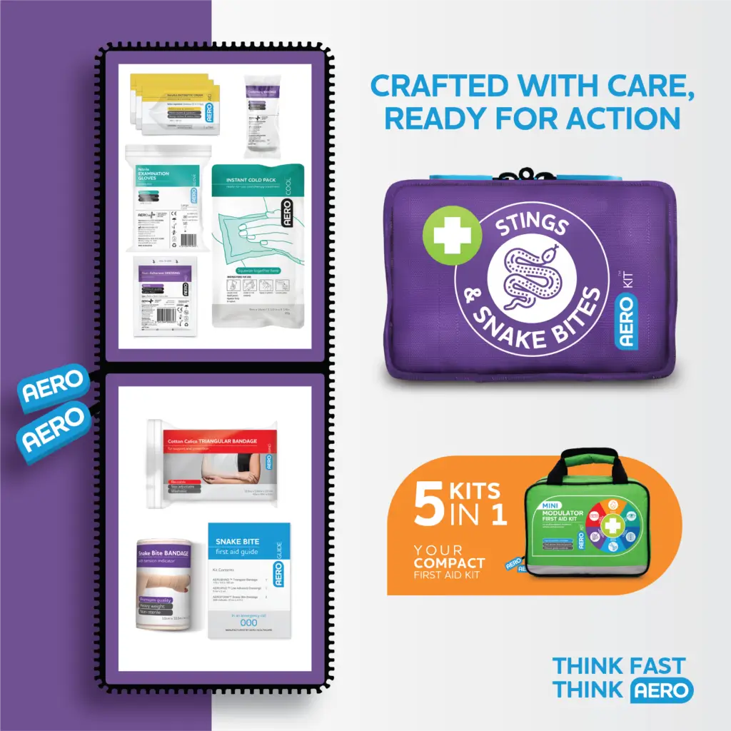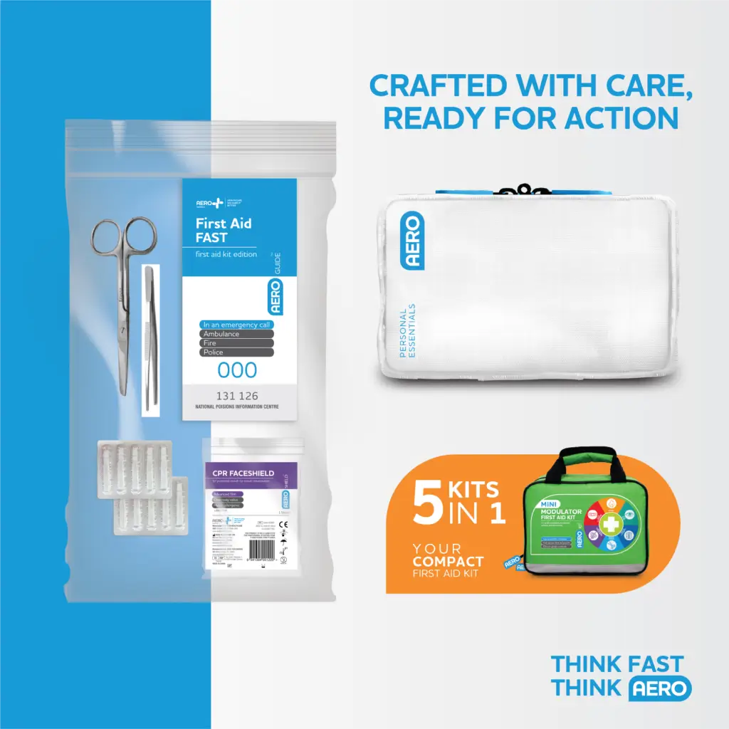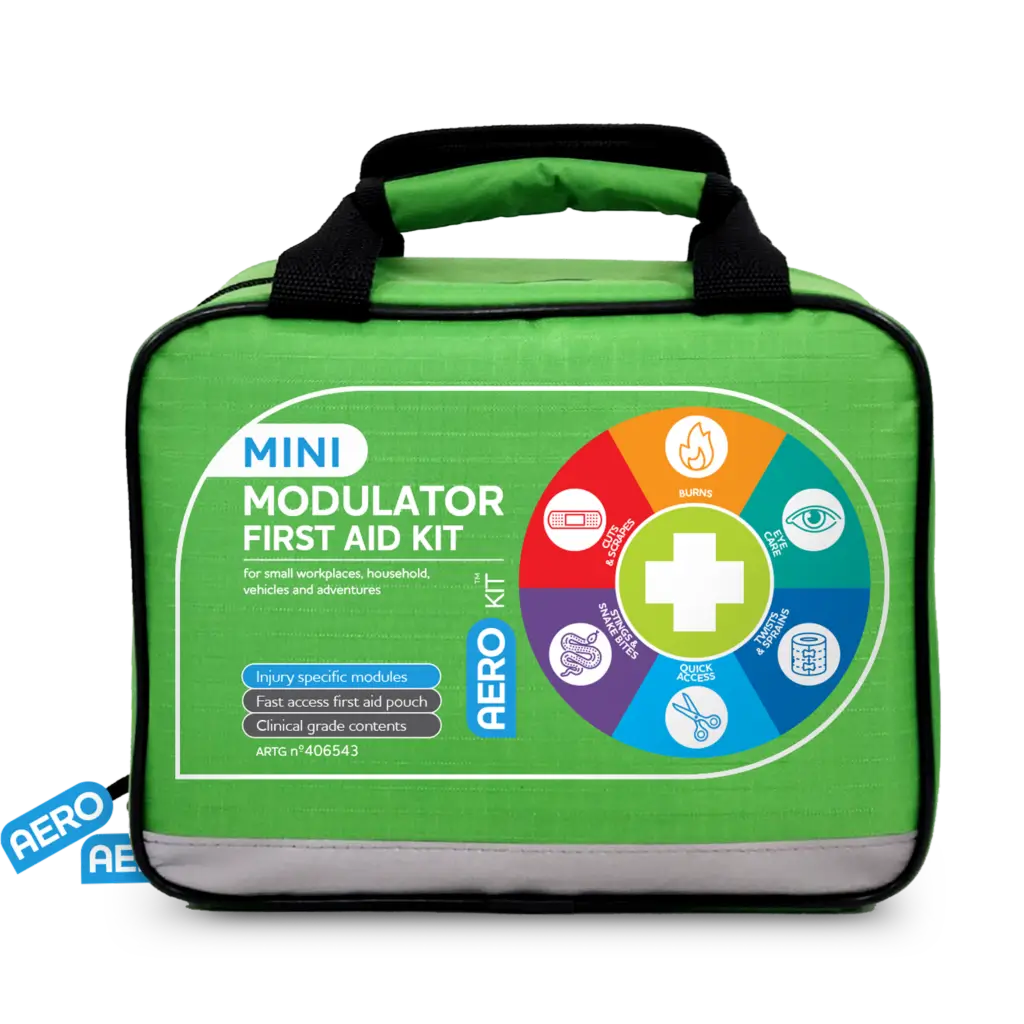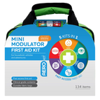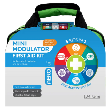 The AeroKit™ Mini Modulator First Aid Kit is perfect for small workplaces, homes, vehicles, and adventures. Whether you're treating burns, eye wounds, twists and sprains, stings and snakebites, or cuts and scrapes, this kit has you covered. Be ready for any emergency with the AeroKit™ Mini Modulator. Five Kits in.