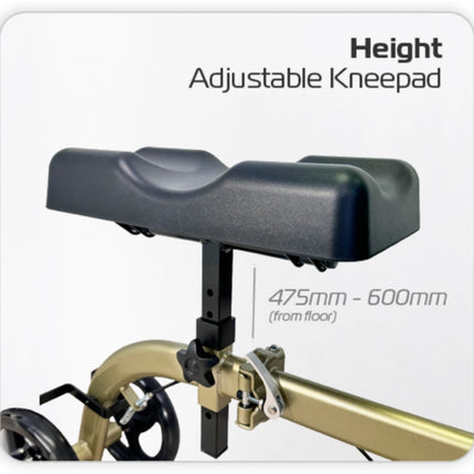 Adjustable Padded Kneepad: Contoured and padded kneepad (365 mm x 180 mm) with adjustable height from 475 mm to 600 mm for optimal leg positioning.